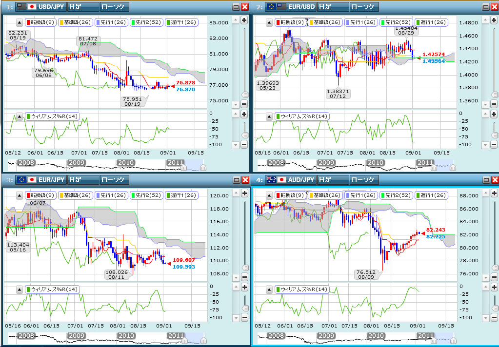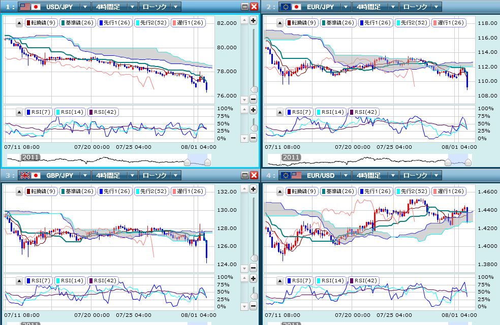 ・NY外為市場は発表された米7月ISM(米供給管理協会)製造業景況指数が54.0と事前予想の54.5を下回ってリスク回避のユーロ売りにユーロ/ドルは1.4264ドルへと軟調推移、ドル/円はドルが売られ一時76.47円前後の安値