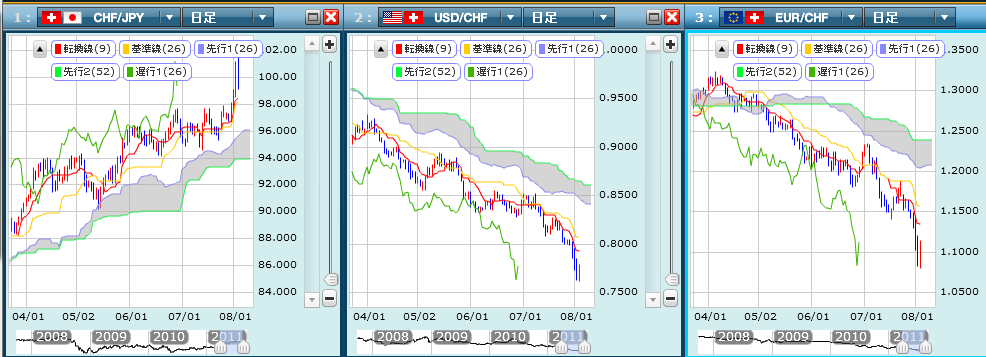主要FX会社のスイスフラン/円の買いスワップポイントは、1万通貨につき、-2~7円(2011年8月2日)