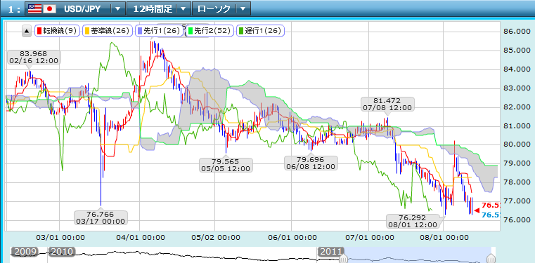 円が史上最高の円高に近づいたところで、介入っぽい上昇(レートチェック)後にまた下落