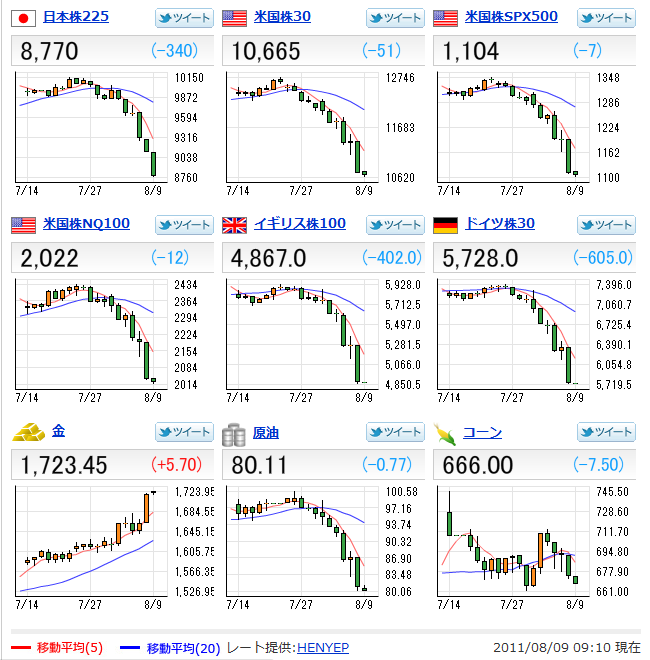 ◆米国債格下げに対する市場の反応は、株や原油が大きく値を崩す中で金や債券が大きく買い進まれると言う、典型的なリスク回避の動きがパニック的に進む結果となった。